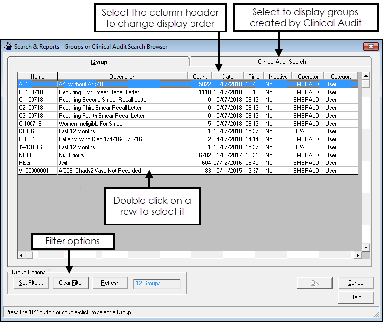 - The Groups or Clinical Audit Search Browser displays. The Browser defaults to the Group view, and lists the groups in alphabetical order:
