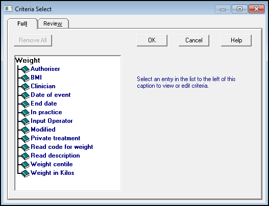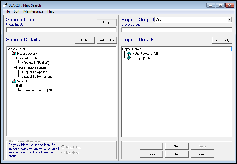 Adding an Entity allows you to search on a specific area of the patient's record, for example, add the entity of Weight, then using selections, find patients with a BMI over 30, recorded in the last year.