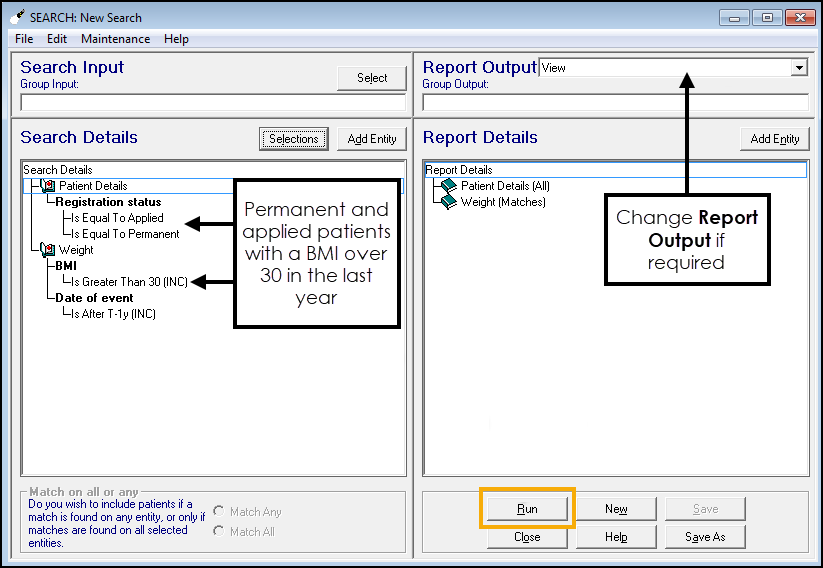 - Choose the criteria you wish to apply to the search and select BMI followed by Add New: