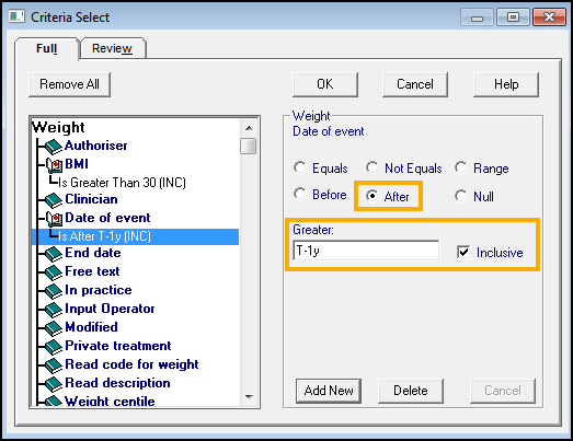 See Number and Date Based Criteria and Text Based Criteria for details. - Add additional criteria, for example, date of event, to find BMIs recorded within a specific time scale. Select Date of Event - Add New, select After and enter a date, or T-1y to look for BMIs in the last year: