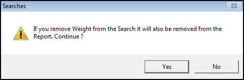 The 'If you remove XXXXX from the Search it will also be removed from the Report. Continue?' message displays.