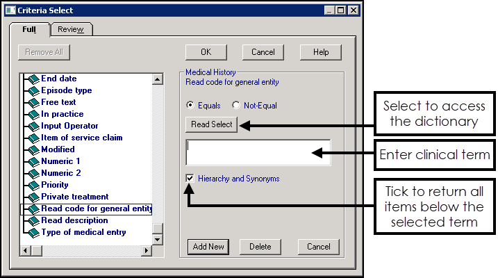 From the Criteria Select screen, there are two ways to select clinical terms: