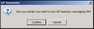 - The 'Are you certain you wish to turn GP Summary messaging ON?' message displays, select Confirm: