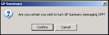 - The 'Are you certain you wish to turn GP Summary messaging OFF?' message displays, select Confirm: