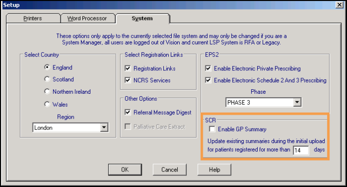- Set how long, in days, a patient must have been registered with the practice for the initial upload to overwrite any pre-existing summary with fresh data. The default is 14 days but you can choose between 0-99 days, enter the required number of days for the statement Update existing summaries during the initial upload for patients registered for more than nn days.