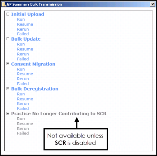 - Practice No Longer Contributing to SCR - This function enables you to send an update summary on additional text when the SCR function is disabled/switched off, for example, if a practice closes. This upload is inactive until the SCR function is switched off, the upload then activates and can be run, see Practice No Longer Contributing to SCR and Enabling/Disabling SCR for details: