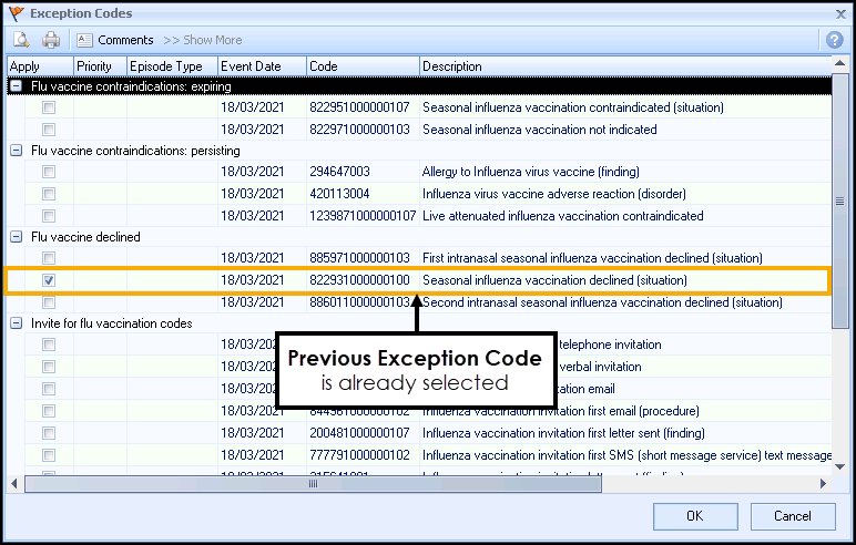 Previously used Exception codes for the selected patient are represented with an Orange flag