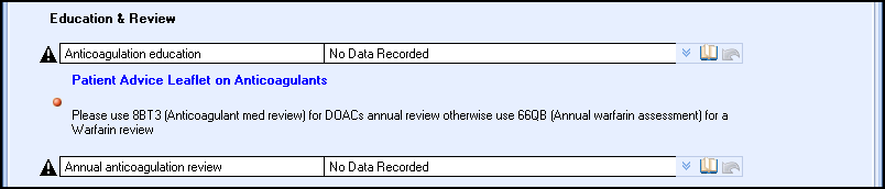 This section of the screen is where you can record education and review information. It also includes a link to the Patient.co.uk website where you can print the Patient Advice Leaflet on Anticoagulants, because you are accessing an external website the leaflet is not recorded in the patient’s record.