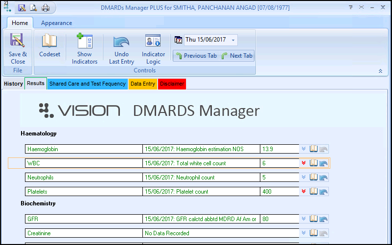 The results tab is pre-populated with the patient's latest blood results and is categorised to help clinicians manage the patient's care. To view previous results click the Previous entries