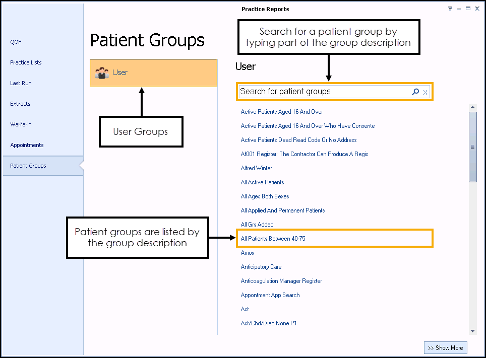 - From Vision+ - Practice Reports, select Patient Groups: