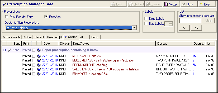The Search tab displays all prescriptions within the last 28 days and is mainly used for reprinting prescriptions.