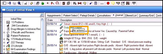 There is a Test Result Tool Tip option available from the Journal, Filtered and Problems views withinConsultation Manager. If you opt to switch the option on, when hovering your mouse pointer over a test result, a tool tip displays showing any Actions and their completion status associated with the result. This option is disabled by default but you can enable it from the Consultation Manager settings screen, see Consultation Manager Setup - General for details.