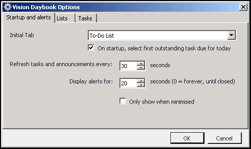 • On startup, select first outstanding task due for today - Tick to display tasks that need to be dealt with today as the starting point within Daybook.