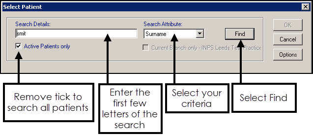 Note - The Active Patients Only tick box and Options are only available on the Select Patient screen if you have rights in Security to view archived patients.