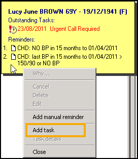- or, if there are existing reminders for the patient, right click on the Reminder and select Add task.