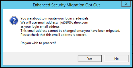 2. The Enhanced Security Migration Opt Out screen displays, detailing the email address that is set up against your account: