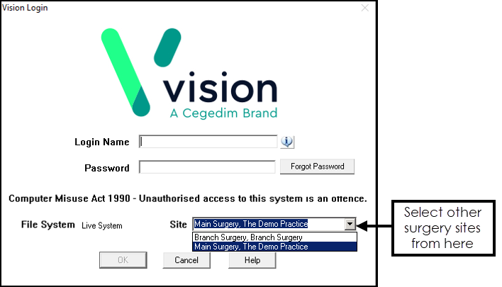 Now log in in the usual way, see Logging into Vision 3 for details if required.