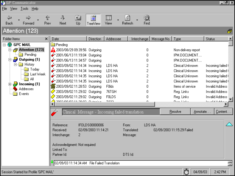 You are able to access an audit trail for messages sent and received in the GP Communicator Module. The audit trail in GPC primarily deals with transmission audit trail and does not show user details. When you select a message (from the Incoming, Outgoing or Attention folders), the bottom pane, shows the full details for the selected mail item. It has a header section showing the administrative details for the message and a full audit trail detailing everything that has happened to the message.
