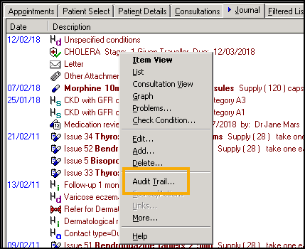 , select the patient required. - From any of the tabs which display data, for example, the journal tab, right click on an entry and select Audit Trail: