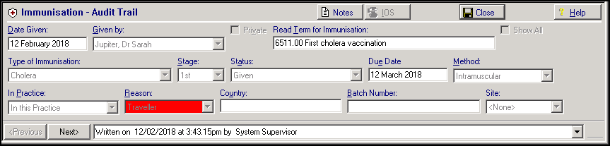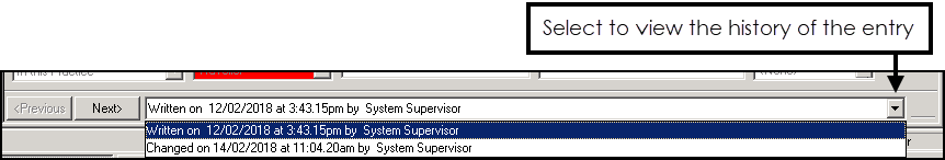 - The original data, date and time of entry display initially. Any fields that display in red have been changed at some time. The 'Written on' line displays the details of when the entry was originally created.