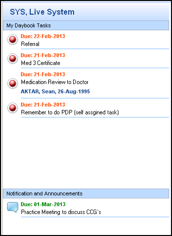 Daybook Tasks and 'Notifications and Announcements' are symbolised by priority and status in the following ways: