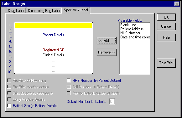- Drag and drop items from Available Fields on to the left-hand side in the order required, click within the left-hand design window and position the yellow line with up/down arrows where you want the item to be inserted and then highlight an item in Available Fields and select Add, or double click on an Available Fields item.Training Tip - You do not need to keep to the default order of lines, but can move items around on the design window as required. The Blank Line and the NHS Number are the two optional items not used in the default design.