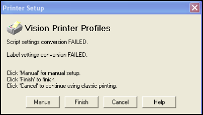 - Finish exists from the screen without Printer Profiles being set up for either Script or Label settings, whichever failed.