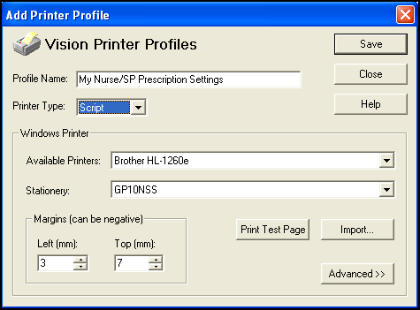 - Print Test Page - This prints a dummy script/label to the selected printer. When you print a test page from either an English or Scottish practice, the barcode prints on the prescription, so that the print settings can be validated. This occurs even if the practice is not enabled for ETP (electronic transmission of prescriptions).