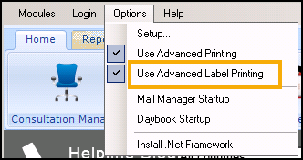 To enable Advanced Label Printing, from the Vision 3 Front Screen, select Options - Use Advanced Label Printing:
