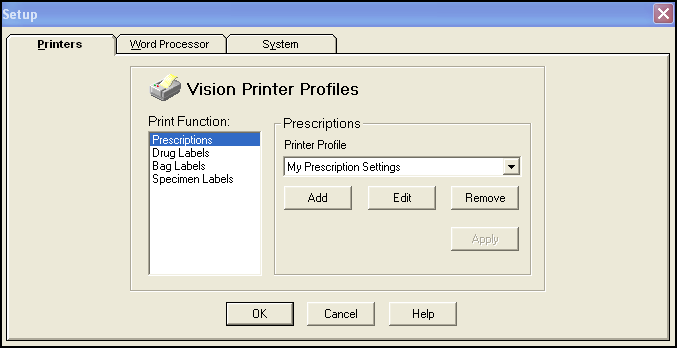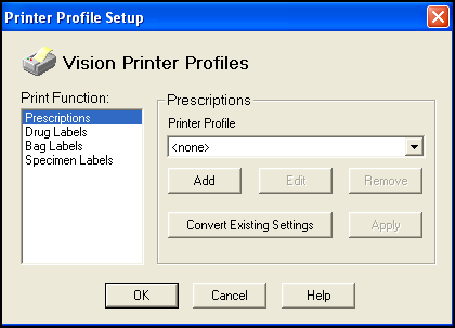 Printer Profile - Lists all profiles that have been created on this workstation that correspond to the selected print function, for example, My Prescription Settings.