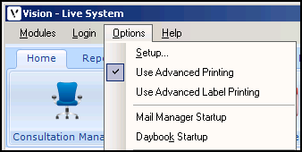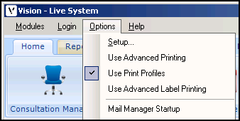 From the Vision 3 Front Screen, select Options - Advanced Printing. This ticks Advanced Printing to show it is selected, and the menu option Use Print Profiles disappears.