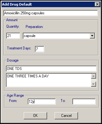 9. The Add Drug Default screen displays, add the quantity, dosage and age range defaults and where appropriate the age range for this default: