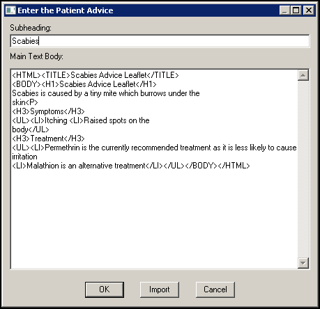 . - The Enter the Patient Advice screen displays, in Subheading enter a suitable sub-heading