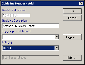 • Guideline Mnemonic - Enter a shorthand title, up to 10 characters, to identify the report, for example, ADMIS_SUM, the mnemonic must not contain spaces.