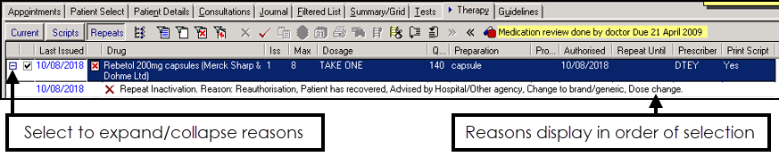 Inactivation and Reauthorisation Change Reasons display in the order they were selected, followed by any additional comments indicated by '<<text here>>'. For a reauthorisation, the first reason is always 'Reauthorisation'.