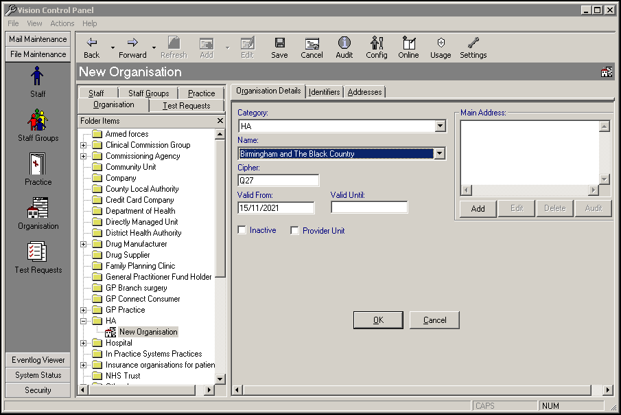 Optionally, under Main Address, select Add, complete the details as appropriate and select OK to save.