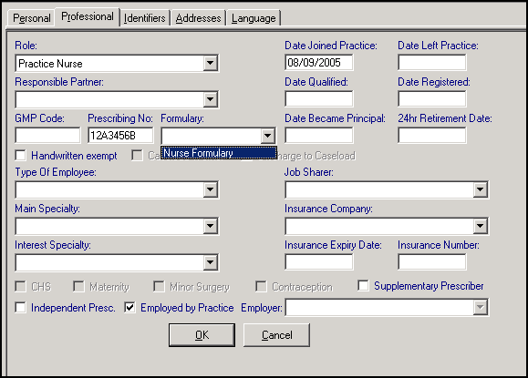 Some nurses can prescribe and print prescriptions and this should be set up when they are added. You should record the NMC PIN in Identifiers for all nurses at your practice.