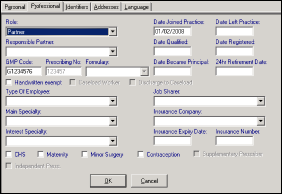 - Now, select the Staff Identifiers tab, particularly for GPs, to enter the local health authority code, see Staff Identifiers - for a GP for details.