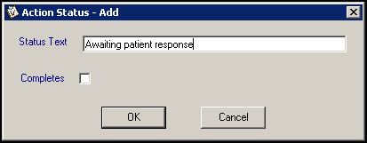 - Completes - Each action can be outstanding or complete. The status further qualifies the outstanding state but application of a particular status code may implicitly complete the action. For example, an action of 'Make an appointment' with a status code of 'Appointment made' is implicitly complete. Tick Completes on any status that would indicate a complete action. Note - 'Completed' does not necessarily mean completed successfully, numerous status codes may mark an action as complete even though they have not been successfully performed.