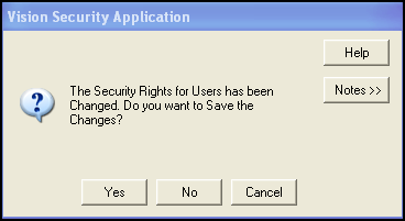 Before exiting Security or switching to another module, if you have made any changes involving the access of a member of staff, a Vision function, or the addition or removal of a user from a group, a 'The Security Rights for Users has been Changed. Do you want to Save the Changes? Yes/No' warning displays: