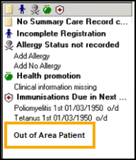 If a patient is marked as residing outside of your catchment area, this is highlighted as an alert within the Patient Alert pane: