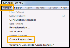 , select the patient record concerned. - Select Action - Cancel Registration:
