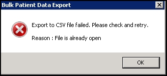 If there is a problem with the export, the Bulk Patient Data error message displays detailing the issue: