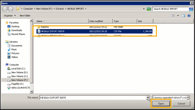 The Open screen displays at P:\Extracts\HB BULK IMPORT by default, select the file required and select Open: