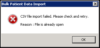 If there is a problem with the import, the Bulk Patient Data Import error message displays detailing the issue, select OK to rectify the issue and try again: