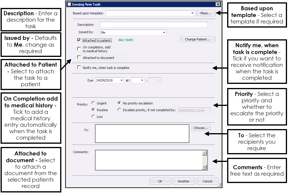 • Attached to patient - Tick to attach this task to a patient. To select the patient select Change Patient and select a patient in the usual way, see Selecting a Patient if required.