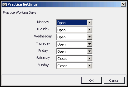 Practice settings are used by Daybook to work out when a task is due; it enables the system to skip weekends when a due date is entered as nn days (where nn is a number).