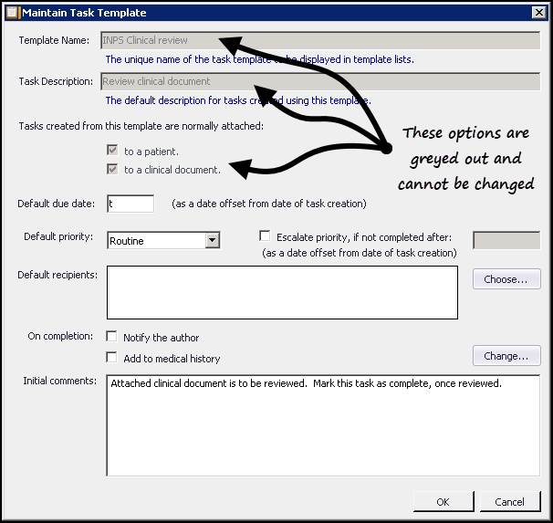 Important - It is highly recommended that you add default recipients to this template. Clinical Review tasks are always assigned to the staff who is allocated to the message, in case of staff absence it is useful to have at least one other member of staff receive the Clinical Review tasks. This is especially useful for messages that are not automatically allocated to staff.Change the Initial comments if required.