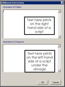 The 'Information for Patient' field is used to add free text information for a patient which prints on the right hand side of a prescription, for example, to remind the patient to book a blood test before their next prescription or appointment. The 'Information for Dispenser' field is used to add free text information for the dispenser which prints on the left hand side of a prescription under the drug dosage.