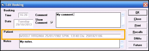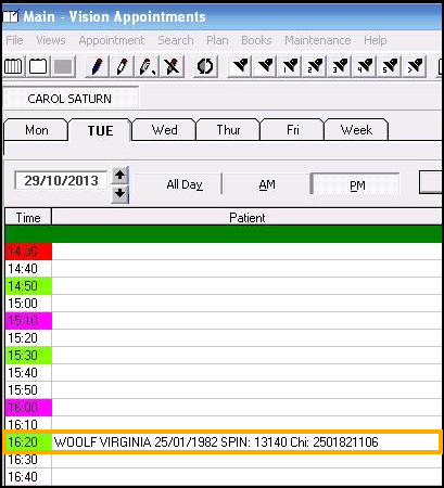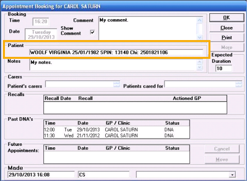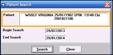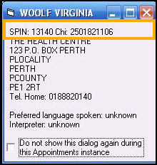 When searching for a patient's past and future appointments using either Search - Patient Search, or by pressing F3 on your keyboard, the patient's SPIN and CHI displays in Patient: